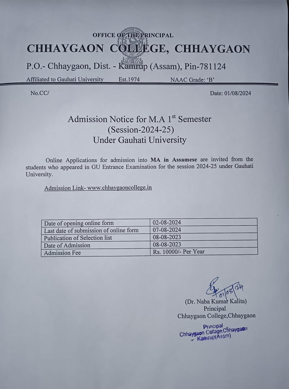 | 89 | Online Application for admission into MA in Assamese are invited from the students who appeared in GU Entrance Examination for the Session 2024-25 under Gauhati University. | 2024-08-01 | View File |