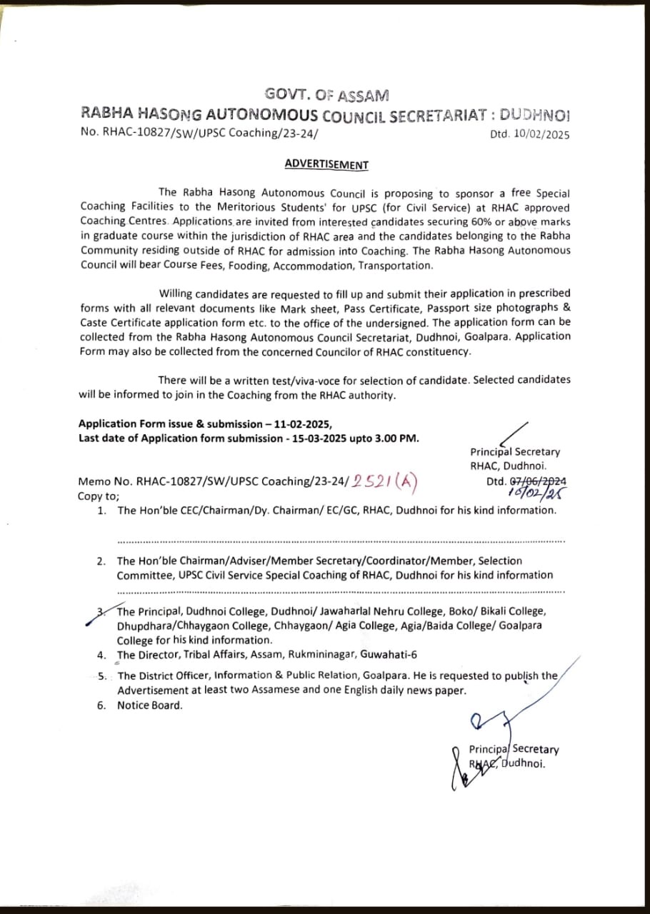 | 75 | Free coaching facilities to meritorious students for UPSC (civil service) at RHSC, Dudhnoi | 2025-02-21 | View File |